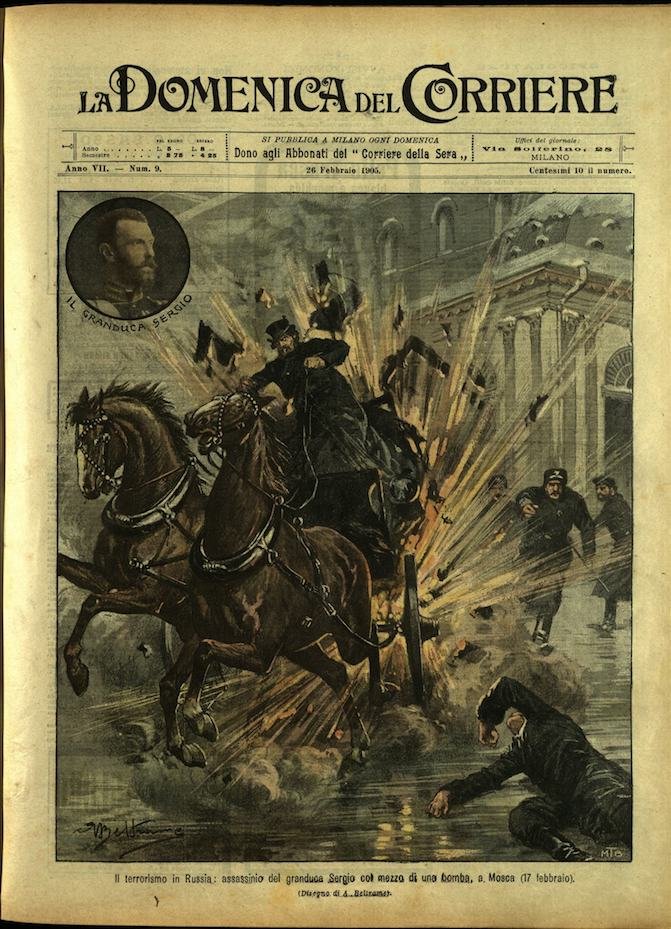In-4, brossura, in buono stato di conservazione. In questo numero:"Il terrorismo in Russia, assassinio del granduca Sergio col mezzo di una bomba, a Mosca (17 febbraio).""Il crollo del ponte Egiziano sul fiume Fontanka a Pietroburgo, mentre passava la cavalleria.""Il grave pericolo corso da un treno della ferrovia elettrica alla stazione di Varese.".