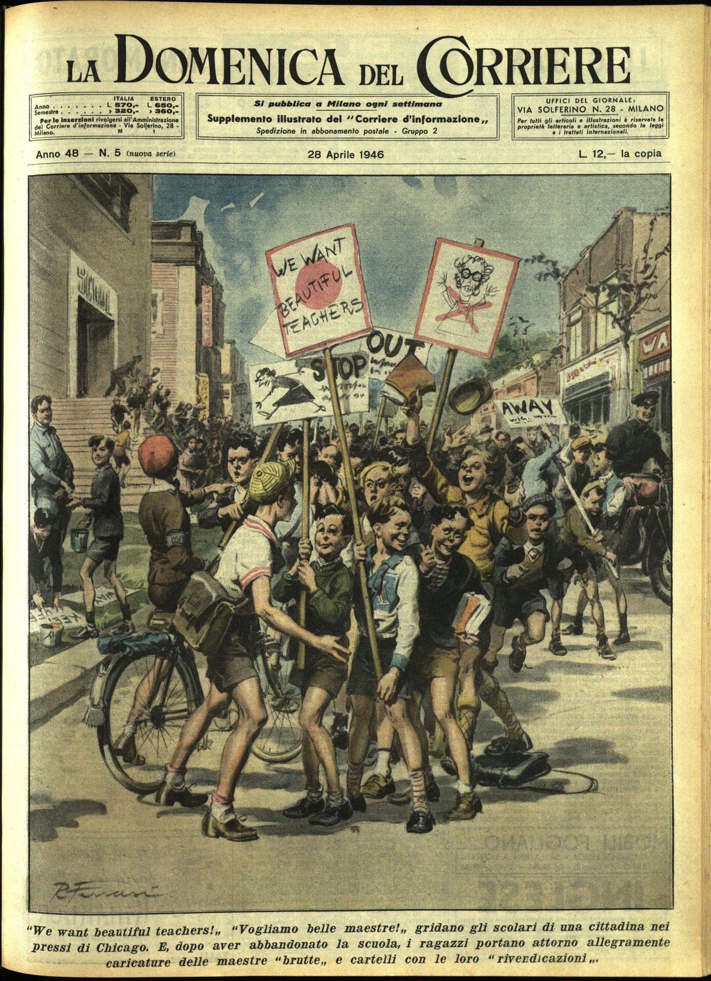In-4, brossura, in buono stato di conservazione. In questo numero:"We want beautiful teachers! Vogliamo belle maestre! gridano gli scolari di una cittadina nei pressi di Chicago. E, dopo aver abbandonato la scuola, i ragazzi portano attorno allegramente caricature delle maestre brutte e cartelli con le loro rivendicazioni.""L'uomo che regalava biglietti da mille. Vi regalo un biglietto da mille, ve ne regalo due, tre, quattro, ve li regalo tutti urlava un uomo sulla piazza di Modena in giorno di mercato. La folla lo guardava dubbiosa e nessuno osava accettare quello strano regalo di autentiche banconote. Poi un tale si fece coraggio, ne afferro un mazzetto, quindicimila lire in tutto, e scappo via.. Nel frattempo qualcuno aveva avvertito i carabinieri e lo strano strillone veniva condotto al sicuro, cioe al manicomio..".