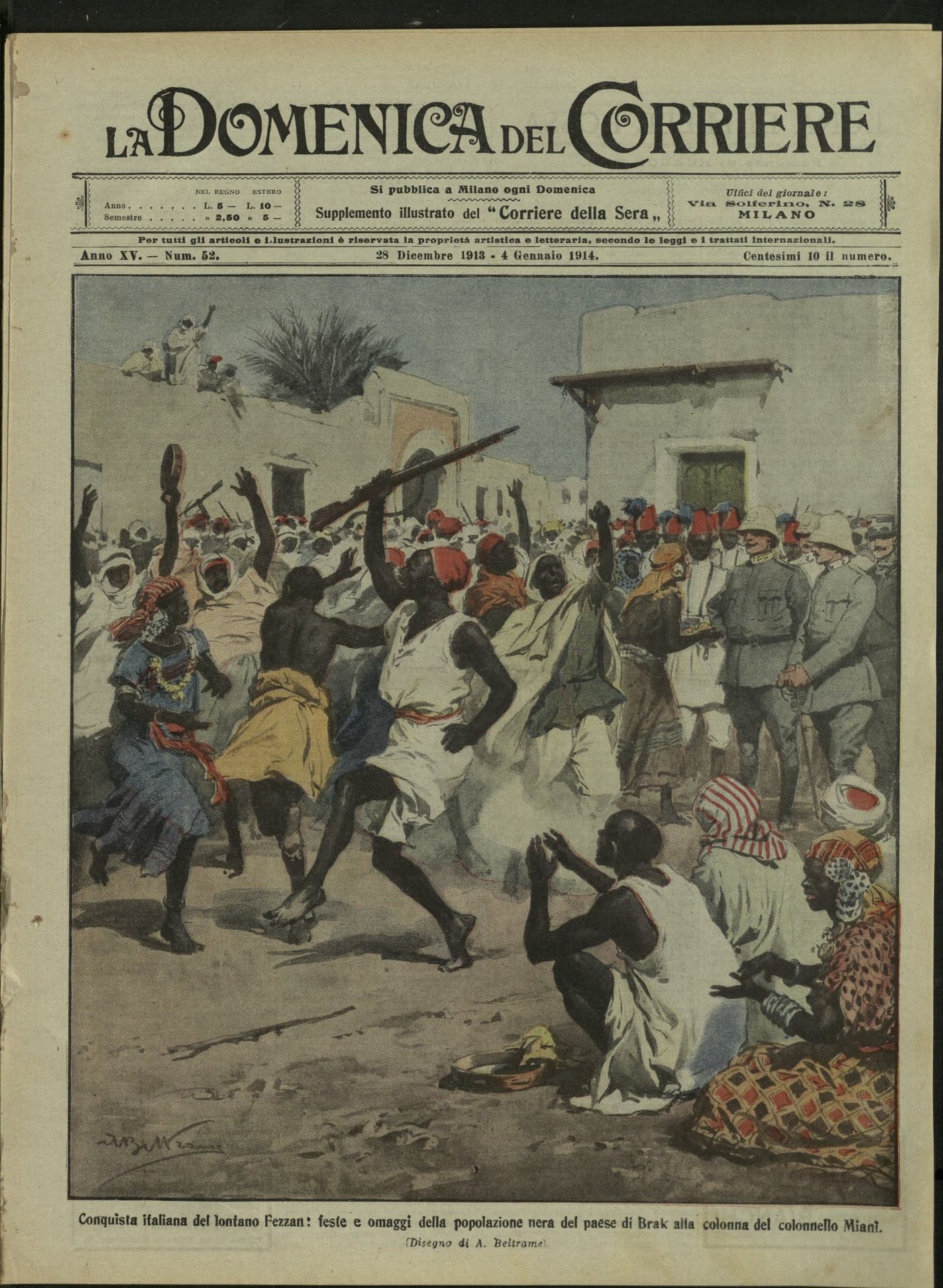 In-4, brossura, in buono stato di conservazione. In questo numero:Conquista italiana del lontano Fezzan: festa e omaggi della popolazione nera di Brak alla colonna del colonnello Miani"Mucca inferocita che uccide un uomo ed e poi investita e stritolata da un treno fra Lucca e Castelnuovo.".