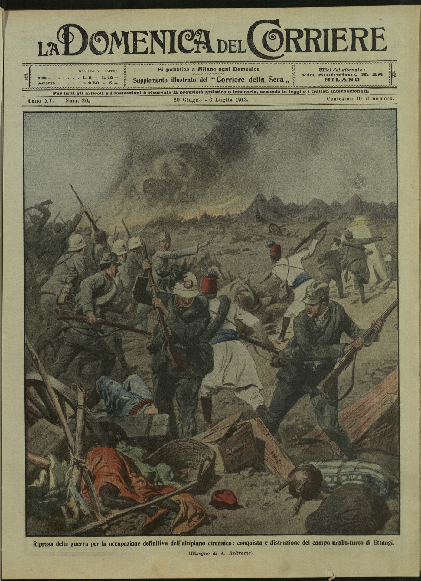 In-4, brossura, in buono stato di conservazione. In questo numero:"Ripresa della guerra per la occupazione definitiva dell'altipiano cirenaico, conquista e distruzione del campo arabo-turco di Ettangi.""Ottanta donne russe bruciate vive per vendetta avendo acconsentito a lavorare per un salario inferiore a quello voluto dagli operai.".