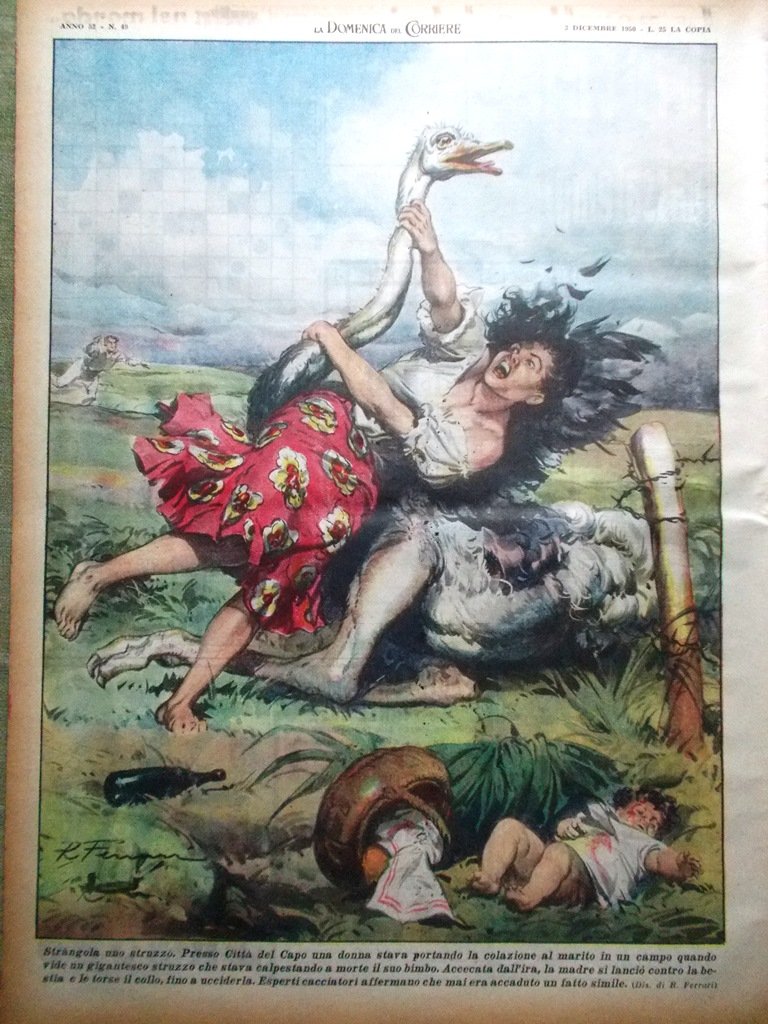 Presso Città del Capo una donna stava portando la colazione al marito in un campo quando vide un gigantesco struzzo che stava calpestando a morte il suo bimbo. Accecata dall'ira la madre si lanciò contro la bestia e le torse il collo fino a ucciderla. Esperti cacciatori affermano che mai era accaduto un fatto simile (R. Ferrari)