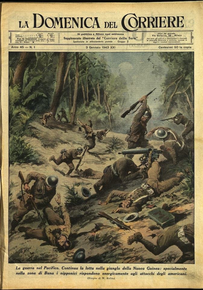 In-4, brossura, in buono stato di conservazione. In questo numero:"La guerra nel Pacifico. Continua la lotta nella giungla della Nuova Guinea, specialmente nella zona di Buna i nipponici rispondono energicamente agli attacchi degli americani.""Notte di Natale sotto il mare. - Suggestivo spettacolo a bordo di un sommergibile italiano. Riuniti davanti ad un improvvisato altare, ufficiali e marinai ascoltano in commosso raccoglimento la Messa celebrata da un cappellano militare.".
