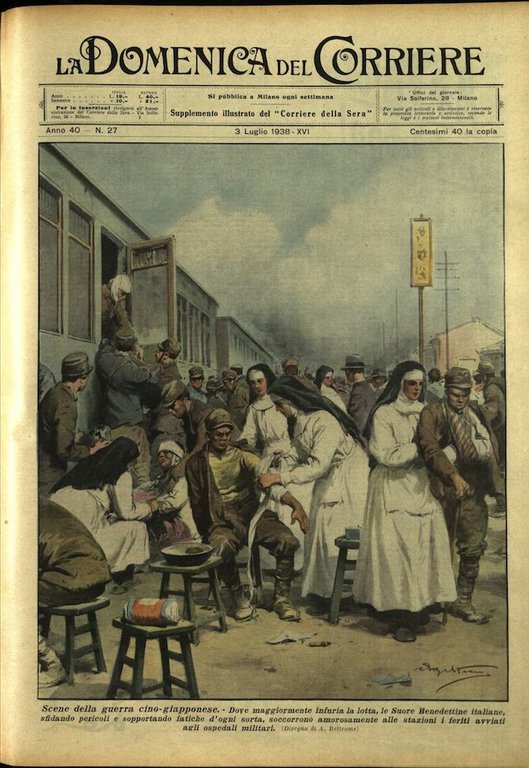 In-4, brossura, in buono stato di conservazione. In questo numero:"Scene della guerra cino-giapponese. - Dove maggiormente infuria la lotta, le Suore Benedettine italiane, sfidando pericoli e sopportando fatiche d'ogni sorta, soccorrono amorosamente alle stazioni i feriti avviati agli ospedali militari.""All'assalto dell'Everest. - Sfiorati da una enorme valanga mentre tentavano di raggiungere le inviolate vette dell'Imalaia, un europeo e tre portatori indigeni venivano lanciati nel vuoto dal tremendo spostamento d'aria. I compagni di cordata, piantando le piccozze nel ghiaccio, riuscivano a trattenerli e ad evitare una sciagura.".