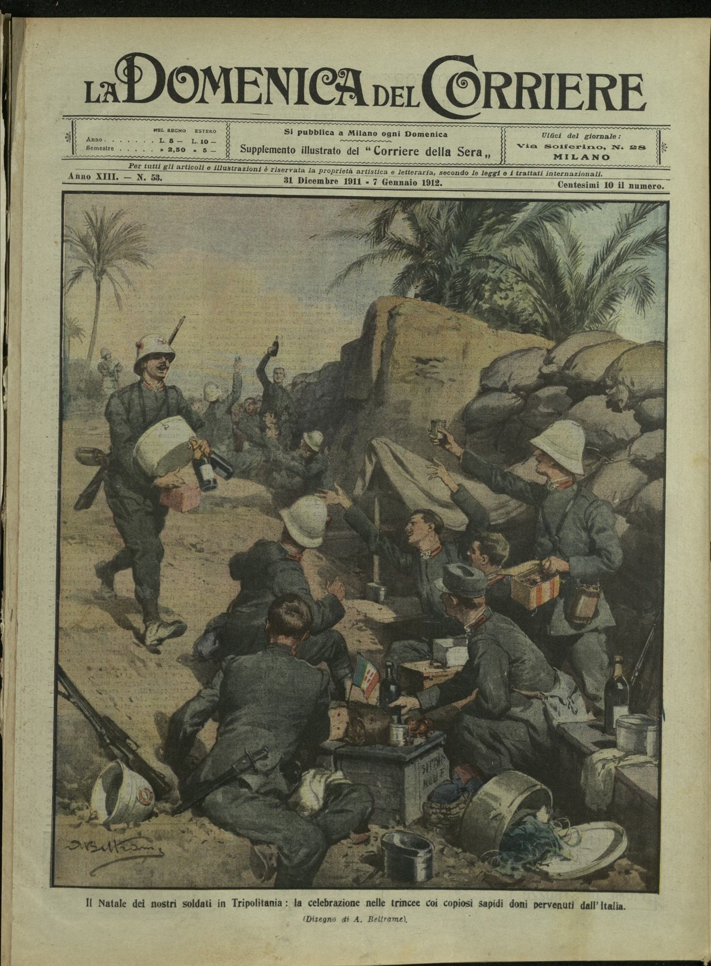 In-4, brossura, in buono stato di conservazione. In questo numero:"Caporale del Piacenza cavalli, sperdutosi oltre Bengasi, e assalito da due beduini che uccide e torna in salvo coi loro cavalli.""Il Natale dei nostri soldati in Tripolitania, la celebrazione nelle trincee coi copiosi sapidi doni pervenuti dall'Italia.".