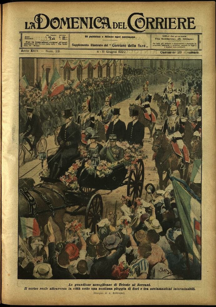 In-4, brossura, in buono stato di conservazione. In questo numero:"Le grandiose accoglienze di Trieste ai Sovrani. Il corteo reale attraversa la città sotto una continua pioggia di fiori e tra acclamazioni interminabili.""L'ultima tappa del viaggio trionfale dei Sovrani. A Zara, il popolo delirante s'accalca a tal punto per festeggiare il Re, la Regina e la Principessa Jolanda, che l'automobile reale è costretta a continue soste.".