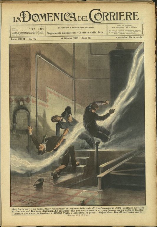In-4, brossura, in buono stato di conservazione. In questo numero:due ingegneri e un capotecnico visitavano un reparto delle sale di trasformazione della centrale elettrica di Olevano sul Tusciano (Salerno). Ad un tratto una grande fiammata si sprigionava da un potente trasformatore che eleva la tensione a 60.000 Volta e investiva in pieno i disgraziati. Due di essi sono morti."In piena foresta indiana, un uomo aspetta il treno vicino alla linea ferroviaria. Improvvisamente un boa assale il malcapitato, stringendolo nelle proprie spire potenti. Ma ecco una tigre slanciarsi a sua volta contro l'enorme rettile il quale avvolge, allora, anche la belva nella stretta mortale. Sul mostruoso groviglio sopraggiunge, frattanto, il treno.. Il viluppo è spezzato sanguinosamente dalle ruote del convoglio.".