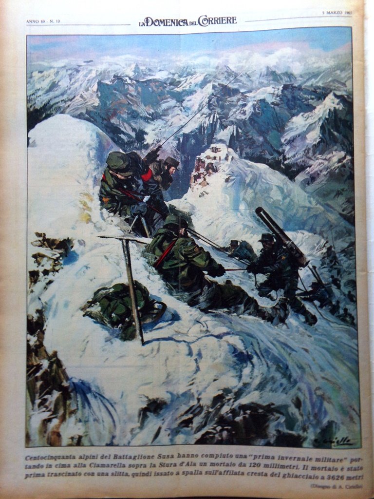 150 alpini del Battaglione Susa hanno compiuto una "prima invernale militare" portando in cima alla Ciamarella sopra la Stura d'Ala un mortaio da 120 millimetri. Il mortaio è stato prima trascinato con una slitta, quindi issato a spalla sull'affilata cresta del ghiacciaio a 3626 metri (disegno di A. Ciriello)