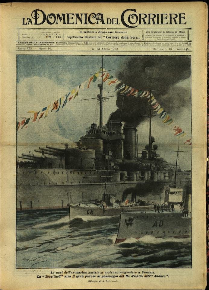 In-4, brossura, in buono stato di conservazione. In questo numero:"Le navi dell'ex-marina austriaca arrivano prigioniere a Venezia. La Tegetthoff alza il gran pavese al passaggio del Re d'Italia sull'Audace.""Una festa patriottica a Borgo Valsugana. Il battesimo dei primi tre nati dopo la redenzione del paese, è stato celebrato con grande solennita, con l'intervento delle autorita militari e civili. La Brigata Torino aveva mandato una musica reggimentale.".