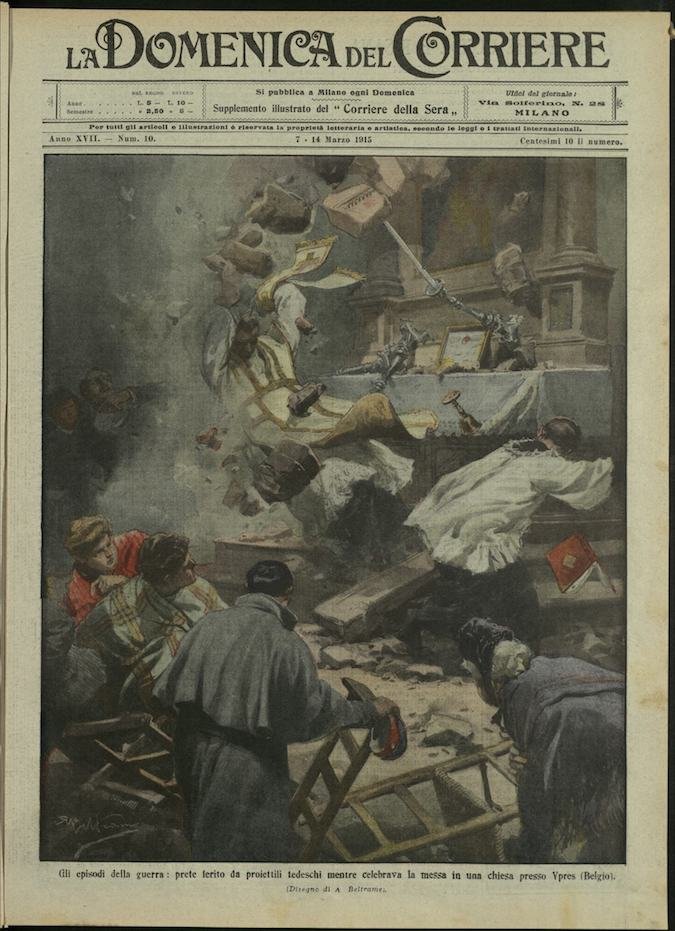 In-4, brossura, in buono stato di conservazione. In questo numero:"Gli episodi della guerra, prete ferito da proiettili tedeschi mentre celebrava la messa in una chiesa presso Ypres (Belgio).""Soldato tedesco portatore di materie incendiarie che prende fuoco e arde come una torcia e fugge terrorizzato in Lorena.".