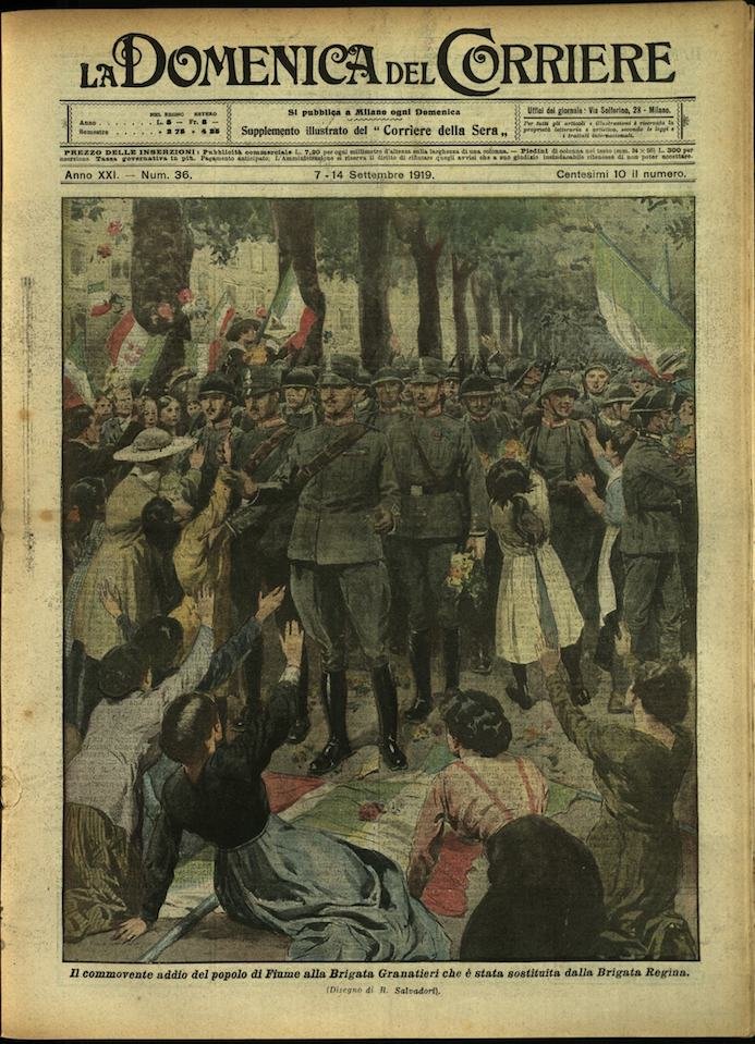 .In-4, brossura (dorso abraso), in buono stato di conservazione. In questo numero:Il commovente addio del popolo di Fiume alla Brigata Granatieri che è stata sostituita dalla Brigata ReginaIl caldo a Londra. Dall'alto della sua colonna Nelson ha assistito ripetutamente in questi giorni a uno spettacolo insolito e pittoresco: turbe di ragazzi prendevano d'assalto le fontane di Trafalgar Square...