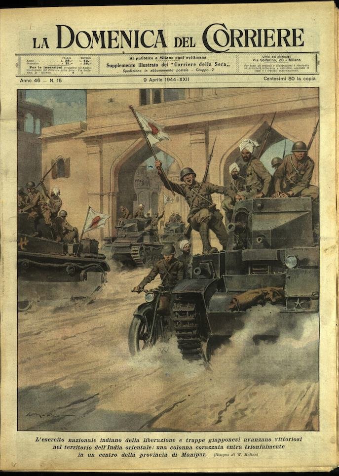 In-4, brossura, in buono stato di conservazione. In questo numero:"L'esercito nazionale indiano della liberazione e truppe giapponesi avanzano vittoriosi nel territorio dell'India orientale, una colonna corazzata entra trionfalmente in un centro della provincia di Manipur.""Fratelli eroici. Romolo e Angelo Vannini, perduti il padre e la sorella nel bombardamento di Urbania (Pesaro), si arruolarono. A Cassino, uscito di pattuglia è rimasto ferito, Romolo venne raggiunto carponi dal fratello sotto il crepitare dei colpi, ma si rifiuto di lasciare il suo posto. Insieme con Angelo sparo fin l'ultimo caricatore della sua mitragliatrice, e al fratello che voleva portarlo in salvo rispose, Prima l'arma!. E soltanto dopo che questa fu trascinata nelle nostre linee si lascio recare sulle spalle. Poco dopo una raffica colpiva a morte i due eroi.".