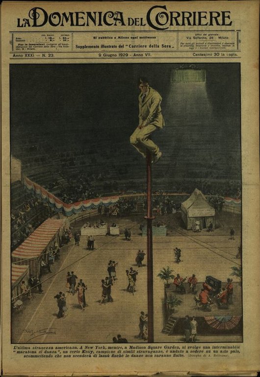 In-4, brossura, in buono stato di conservazione. In questo numero:"Un po' di refrigerio agli atleti. Alla fine delle gare di allenamento, sul campo dell'Accademia militare di West Point, gira un carrettino speciale che distribuisce la gioia di una breve doccia ai giovani campioni.""L'ultima stranezza americana. A New York, mentre, a Madison Square Garden, si svolge una interminabile maratona di danza, un certo Kelly, campione di simili stravaganze, è andato a sedere su un alto palo, scommettendo che non scendera di lassù finché le danze non saranno finite.".