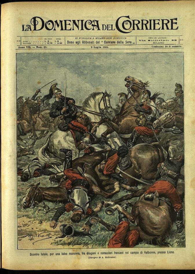In-4, brossura, in buono stato di conservazione. In questo numero:"Scontro fatale, per una falsa manovra, fra dragoni e corazzieri francesi nel campo di Valbonne, presso Lione.""Diligenza svizzera che precipita in un burrone lungo la strada di Briga (Sempione) alla valle del Rodano.".