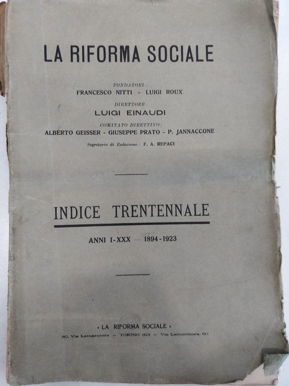 LA RIFORMA SOCIALE. INDICE TRENTENNALE. ANNI I-XXX. 1894-1923. | Périodiques |
