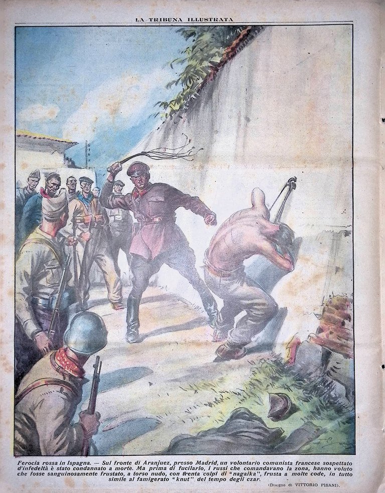 Ferocia rossa in Spagna. Sul fronte di Aranjuez, presso Madrid, un volontario comunista francese sospettato di infedeltà è stato condannato a morte. Ma prima di fucilarlo, i russi che comandavano la zona, hanno voluto che fosse sanguinosamente frustato, a torso nudo, con trenta colpi di "nagaika", frusta a molte code, in tutto simile al famigerato "knut" del tempo degli czar (disegno di Vittorio Pisani)
