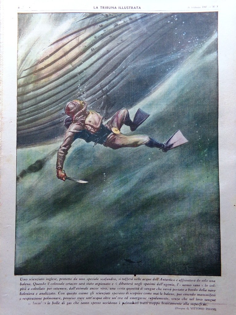 Uno scienziato inglese, protetto da uno speciale scafandro, si tufferà nelle acque dell'Antartico e affronterà da solo una balena. Quando il colossale cetaceo sarà stato arpionato e si dibatterà negli spasmi dell'agonia, l'uomo-rana lo colpirà a coltellate per ottenere dall'animale ancor vivo una certa quantità di sangue che verrà portato a bordo della nave baleniera e analizzato. Con questo esame gli scienziati sperano di scoprire come mai le balene, pur essendo mammiferi a respirazione polmonare, possono stare sott'acqua oltre un'ora ed emergerne rapidamente, senza che nel loro sangue si formino le bolle di gas che tanto spesso uccidono i palombari tratti troppo bruscamente alla superfice (disegno di Vittorio Pisani)