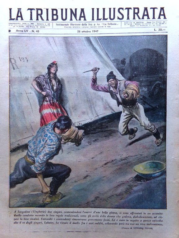 A Szegedino (Ungheria) due zingari, contendendosi l'amore d'una bella gitana, si sono affrontati in un accanito duello condotto secondo le loro regole tradizionali, sotto gli occhi della donna che godeva, diabolicamente, ad aizzare la loro rivalità. Enrambi i contendenti rimanevano gravemente feriti. Ed è stato in seguito a questo episodio che il re degli zingari, Lakatos, ha vietato il duello fra i suoi sudditi, sollevando però tra essi un vivo malcontento (disegno di Vittorio Pisani)