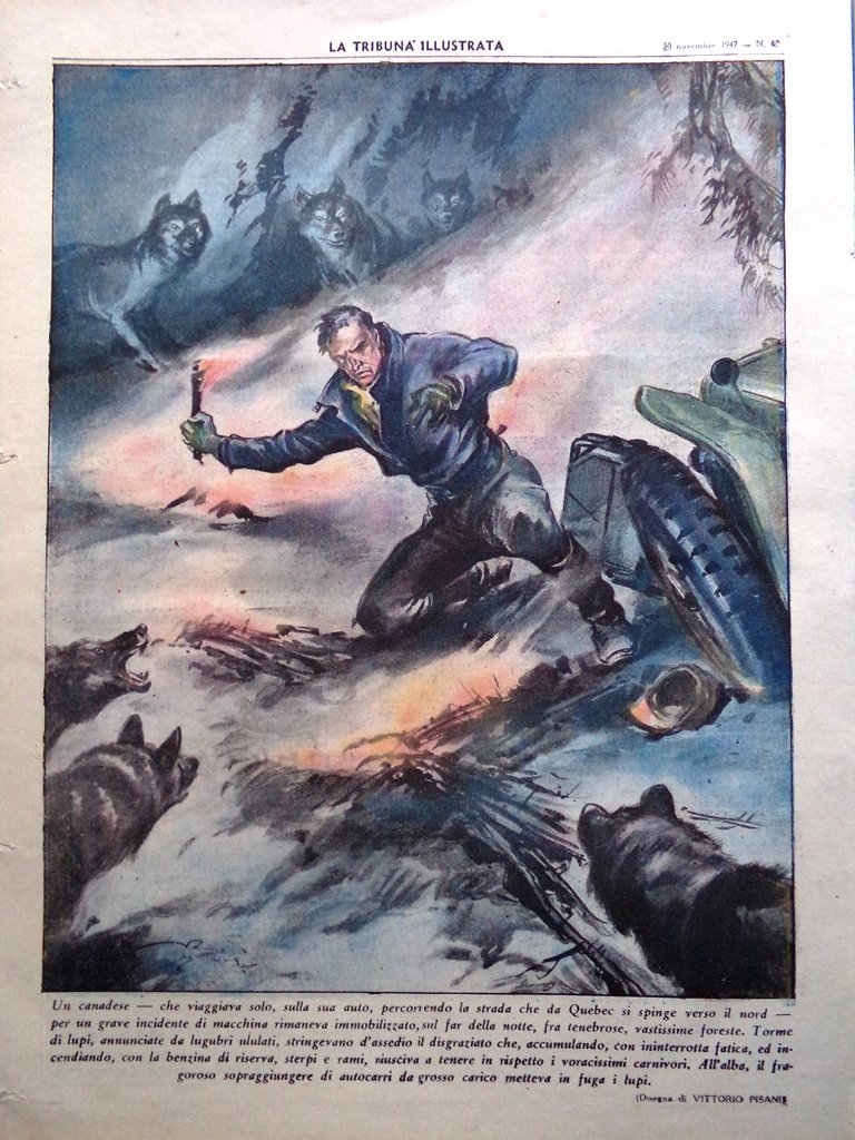 Un canadese, che viaggiava solo, sulla sua auto, percorrendo la strada che da Quebec si spinge verso il nord, per un grave incidente di macchina, rimaneva immobilizzato sul far della notte, fra tenebrose, vastissime foreste. Torme di lupi, annunciate da lugubri ululati, stringevano d'assedio il disgraziato che, accumulando con ininterrotta fatica, ed incendiando, con la benzina di riserva, sterpi e rami, riusciva a tenere in rispetto i voracissimi carnivori. All'alba il fragoroso sopraggiungere di autocarri da grosso carico metteva in fuga i lupi (disegno di Vittorio Pisani)