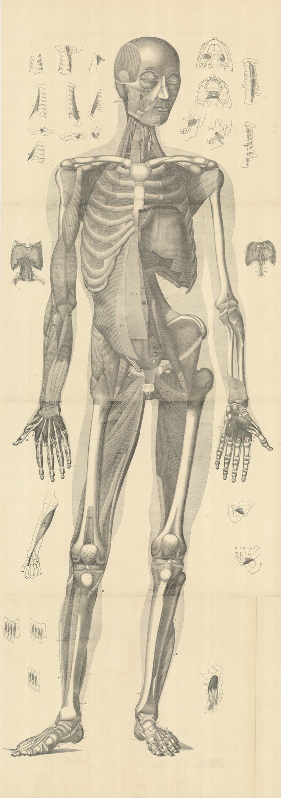 Rappresentazione in scala 1:1 del corpo umano in quattro fogli (660x500 mm ciascuno). Il disegno raffigura l'apparato muscolo scheletrico anteriore. Inserita nella famosa opera che riproduceva il corpo umano in grandezza naturale "Anatomischer Atlas des Menschlichen Körpers in natürlicher Größe, Lage und Verbindung der Theile in 84 Tafeln und erklärendem" descritta dal Weber. Moritz Ignaz Weber (1795-1875) fu stimato Professore di Anatomia Comparata e Patologica. Spese tutta la sua vita nel campo dell'anatomia e delle scienze associate pubblicando numerosi studi. L’Anatomischer Atlas, che raffigura il corpo umano in 84 tavole litografiche a grandezza naturale, è senza dubbio uno dei suoi lavori più importanti. Autore: Weber, Moritz Ignaz (1795-1875). Luogo: Anatomia. Anno: 1849. Tecnica: incisione in rame. Dimensioni: mm 1950x670 i fogli uniti