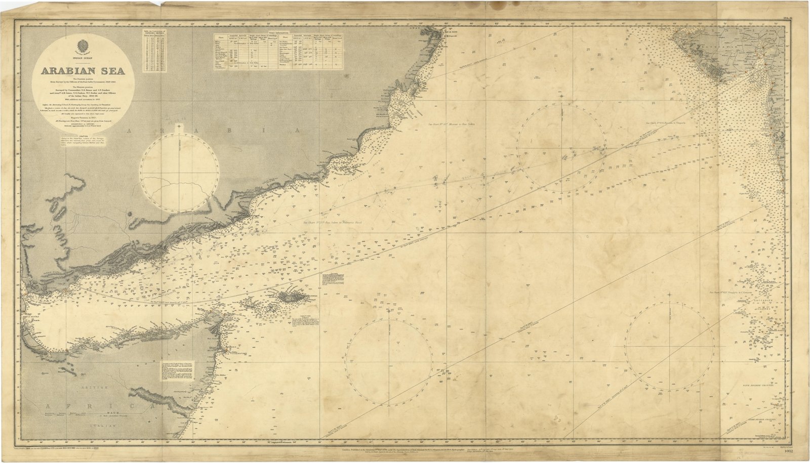 Arabian Sea - The Eastern portion from Surveys by the Officers of the East India Government 1828-1863. The Western portion Surveyed by Commanders S.B. Haines and I.P. Sanders and Lieut. A.M. Grieve, T.G. Carless, W.C. Barker and other Officers of the Indian Navy, 1836-49. With additions and corrections to 1897. London Published at the Admiralty 3rd Feb. 1899, under the Superintendence of Rear Admiral Sir W.J.L. Wharton, Hydrographer. Small corrections: 1931. Editorially folded