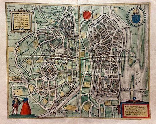 Incisione originale su rame (cm. 42,5x34,5 più ampi margini bianchi) dalla celebre e monumentale opera ‘Civitates Orbis Terrarum’ pubblicata tra il 1572 ed il 1617. Testo in latino al verso. Splendida coloritura antica all’acquarello con ritocchi in oro. Esemplare in ottimo stato di conservazione. Nella parte sinistra è raffigurata la città di Autun e nella destra quella di Nevers, entrambe in Borgogna.