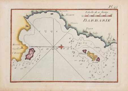 Piano nautico tratto dal " Recueil des principaux plans des ports & rades de la Méditerranée" di Josepgh Roux, pubblicato per la prima volta a Marsiglia nel 1764 e successivamente ristampato - ampliato - a Genova da Yves Gravier con il titolo "Recueil de 163 principaux plans des ports et rades de la Mediterranée" (1804).Ulteriore edizione dell'opera, con il titolo "Plans des ports ed des rades de la Mer Méditerranée." è stampata a Livorno da Carlo Tesi nel 1858. Incisione in rame, finemente acquarellata a mano, in ottimo stato di conservazione. First published in the "Recueil des principaux plans des ports et rades de la Mer Mediterranee", 1764, this nice nautical chart is taken from the rare "Plans des ports ed des rades de la Mer Méditerranée." published in Leghorn by Carlo Tesi, 1858. Copperplate with fine colouring, in very good condition. Cfr.
