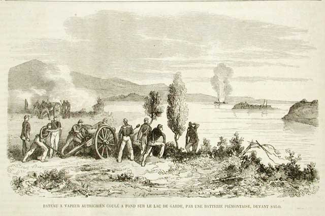 Bateau a vapeur autrichien coule a fond sur le Lac de Garde, par une batterie piemontaise, devant Salò