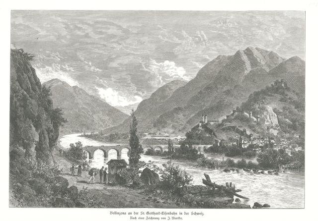 Bellinzona an der St. Gotthard=Eisenbahn in der Schweiz. | Gravures | Weber J. J.