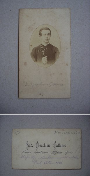 Biglietto con Foto / fotografia Sac. GIOACCHINO CATTANEO Alunno Seminario Missioni Estere. 1886