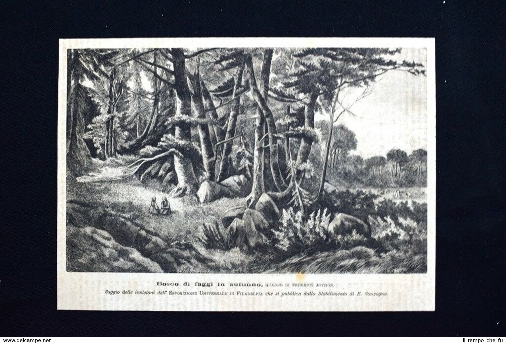 Rara incisione estratta da pubblicazione del 1876. .incisione che ha quindi oltre 141 anni! Bosco di faggi in autunno, quadro di Federico Asthon Saggio delle incisioni dell'Esposizione universale di Filadelfia che si pubblica dallo Stabilimento di E. Sonzogno Dimensioni Cm 23,00 x 17,00 EP1876 - 003 Qualora vogliate delle scansioni migliori contattateci, soddisferemo ogni vostra richiesta. Paypal Carta di credito Bonifico bancario Accuratamente adagiate su un cartoncino e protette da pellicola trasparente rigida, il tutto viene inserito dentro plico di adeguate dimensioni per proteggerne l'integrità.