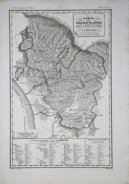 Carta geografica tratta dall’Atlante geografico degli Stati italiani delineato sopra le migliori e più moderne mappe per servire di corredo alla corografia fisica storica e statistica dell'Italia, di Attilio Zuccagni Orlandini ' stampato a Firenze, presso gli editori, 1844. In 2° massimo, 2 voll. Il primo volume contenente le carte dell’Italia Superiore in 52 fogli, il secondo volume quelle dell’Italia Inferiore in 77 fogli. Attilio Zuccagni Orlandini (1784-1872) nacque a Fiesole con il nome di Giuseppe Orlandini. In seguito all’adozione da parte del facoltoso zio materno Attilio Zuccagni (1754-1807), botanico e georgofilo, assunse il nome di Attilio Zuccagni Orlandini. La sua più importante opera è la relazione geografico-cartografica di tutti gli Stati preunitari italiani, la grandiosa ' Corografia fisica, storica e statistica dell’Italia e delle sue Isole ' (Firenze 1835-1845), in dodici volumi per diciannove tomi, con un volume introduttivo sull’intera penisola italiana. L’opera costituì la summa delle centinaia di opere geografiche generali, regionali e locali allora disponibili e presentava, per ogni Stato preunitario, la trattazione fisica, storica, topografica e un inquadramento statistico. Nel 1844-45, la ' Corografia ' fu arricchita con cinque volumi di cartografie, vedute e altre illustrazioni di luoghi e monumenti: ' Atlante geografico degli Stati italiani delineato sopra le migliori e più moderne mappe ' (due volumi con 144 tavole inclusa la grande carta della penisola in 15 fogli) e ' Atlante illustrativo ossia raccolta dei principali monumenti italiani antichi, del medio evo e moderni e di alcune vedute pittoriche ' (tre volumi con 413 illustrazioni, stampate su 269 fogli). Le tavole furono incise, sempre a Firenze, in due apposite officine, da quattro valenti artisti lombardi (Vittorio Angeli, Giacinto Maina, Pietro Manzoni e Giuseppe Pozzi). Soprattutto il primo dei due atlanti rappresenta, ancora oggi, una pietra miliare nella storia della cartografia e dell’iconografia geografica italiana. Fu veramente ‘un’ardua impresa’, dal momento che spesso mancavano ancora (come, ad esempio, per il ' Ducato di Lucca ' e lo ' Stato Pontificio) prodotti cartografici compiutamente geometrici. I due prodotti furono presentati ai Georgofili nel 1843 e nel 1844, insieme alla mappa della Repubblica di San Marino. L’opera si rivelò oltremodo costosa e non ottenne il successo commerciale sperato, ma servì da base per tante altre iniziative editoriali successive che vi attinsero, talora senza neppure rispettarne i diritti d’autore. Incisione in rame, coloritura coeva dei contorni, lievi ossidazioni, per il resto in ottimo stato di conservazione. ' Bibliografia Cfr. Anna Guarducci - ' Dizionario Biografico degli Italiani ' - Volume 100 (2020). Map taken from the ' Atlante geografico degli Stati italiani delineato sopra le migliori e più moderne mappe per servire di corredo alla corografia fisica storica e statistica dell'Italia, di Attilio Zuccagni Orlandini ' printed in Florence, 1844. The first volume contains the maps of Northern Italy in 52 sheets, the second volume those of Southern Italy in 77 sheets. Attilio Zuccagni Orlandini (1784-1872) was born in Fiesole under the name of Giuseppe Orlandini. Following adoption by his wealthy maternal uncle Attilio Zuccagni (1754-1807), a botanist and georgofile, he took the name Attilio Zuccagni Orlandini. ' His most important work is the geographic-cartographic report of all the pre-unification Italian states, the great ' Corografia fisica, storica e statistica dell'Italia e delle sue Isole ' (Florence 1835-1845), in twelve volumes for nineteen tomes, with an introductory volume on the entire Italian peninsula. The work constituted the sum of hundreds of general, regional and local geographic works then available and presented, for each pre-unification state, the physical, historical, topographical and statistical framework. In 1844-45, the Corografia was enriched with five volumes of maps, views and other illustrations of places and monuments: ' Atlante geografico degli Stati italiani delineato sopra le migliori e più moderne mappe ' (two volumes with 144 plates including the large map of the peninsula in 15 sheets) and ' Atlante illustrativo ossia raccolta dei principali monumenti italiani antichi, del medio evo e moderni e di alcune vedute pittoriche ' (three volumes with 413 illustrations, printed on 269 sheets). The plates were engraved, again in Florence, in two special workshops, by four talented Lombard artists (Vittorio Angeli, Giacinto Maina, Pietro Manzoni and Giuseppe Pozzi). ' Especially the first of the two atlases represents, even today, a milestone in the history of cartography and Italian geographic iconography. It was truly 'an arduous undertaking', since cartographic products were often still lacking (as, for example, for the Duchy of Lucca and the Papal States) fully geometric. The two products were presented to the Georgofili in 1843 and 1844, along with the map of the Republic of San Marino. The work proved to be very expensive and did not achieve the commercial success hoped for, but served as a basis for many other subsequent publishing initiatives that drew on it, sometimes without even respecting the copyright. Copperplate with fine outline colour, good condition. ' Literature Anna Guarducci - ' Dizionario Biografico degli Italiani ' - Volume 100 (2020). Cfr.