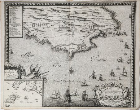 Veduta obliqua basso-alto di Piombino, una base spagnola sulla costa della Toscana che era stata catturata dai francesi nel 1646 e poi riconquistata dagli spagnoli, dal 25 maggio all'8 luglio del 1650. Guerra franco-spagnola (1645-1659). In basso a sinistra un cartiglio con la carta dell’Isola d’Elba e la costa antistante con la città di Piombino. Tavola pubblicata nell'opera ' Les glorieuses conquestes de Louis le Grand roy de France et de Navarre. Sébastien Pontault de Beaulieu (1612-1674) fu un eminente ingegnere francese, che è considerato il primo topografo militare, o piuttosto l'inventore di quest'arte, durante il regno di Luigi XIV. ' Pontault entrò nell'esercito all'età di quindici anni, e si comportò con così tanto spirito all'assedio di La Rochelle, che il Re gli diede il posto di commissario di artiglieria, anche se era così giovane. In seguito, fu presente alla maggior parte delle battaglie e degli assedi, che ha descritto, e non lasciò la vita militare fino a quando la perdita di un braccio e altre ferite, con l'avvicinarsi della vecchiaia, resero necessario il ritiro. Pontault morì il 10 agosto 1674. Era pratica di Pontault seguire l'esercito e costruire sul posto i piani delle battaglie e degli assedi, con accompagnamento storico e prospettico. La sua opera più importante è intitolata Les glorieuses Conquêtes de Louis-le-Grand: ou Recueil, de Plans et Vues des places assiegeés, et de celles ou se_sont douneés des batailles, avec des Discours. Quest'opera è una delle più magnifiche del genere, copre tutte le operazioni di guerra, dalla battaglia di Rocroi, nel 1643, alla presa di Namur, nel 1692. Pontault morì nel 1674; ma l'opera fu completata fino a questa data a spese di sua nipote, la vedova Des Roches. Questa edizione è solitamente chiamata Grand Beaulieu, per distinguerla da una in scala ridotta, in quarto oblungo, chiamata Petit Beaulieu, di cui esistono due serie, una in tre volumi, con le vedute delle azioni nei Paesi Bassi; l'altra in quattro, che include quelle della Francia. Ogni copia contiene una diversa collezione di tavole; per una descrizione dettagliata delle copie BN e BL si veda M. Pastoreau. Le tavole furono poi utilizzate nella pubblicazione del Cabinet du Roi a partire dal 1727 e sono ora conservate al Louvre. Acquaforte su rame, impressa su carta vergata coeva, in ottime condizioni. Bibliografia Pastoreau, ' Les atlas français, Beaulieu XV; Shirley, ' Maps in the Atlases of the British Library ' T.BEAU-16a A low-high oblique view of Piombino, a Spanish base on the coast of Tuscany which had been captured by the French in 1646 and shown here, retaken by the Spanish, from 25 May to 8 July in 1650. Franco-Spanish War (1645-1659). At lower left a cartouche with a map of the Island of Elba and the coast in front with the city of Piombino. Plate published in the work Les glorieuses conquestes de Louis le Grand roy de France et de Navarre. Sébastien Pontault de Beaulieu (1612–1674) was an eminent French engineer, who is considered to be the first military topographer, or rather the inventor of that art, during the reign of Louis XIV. Pontault went into the army at the age of fifteen, and behaved with so much spirit at the siege of Rochelle, that the king gave him the post of commissary of artillery, even though he was so young. He was afterwards present at most of the battles and siege, which he has described, and did not quit a military life until the loss of an arm and other wounds, with the approach of old age, rendered retirement necessary. Pontault died on 10 August 1674. From the death of this able drafts-man, there were few capable military topographers in France until the latter half of the 18th century. It was Pontault's practice to follow the army, and construct upon the spot plans of the battles and sieges, with historical and perspective accompaniments. His most important work is entitled Les glorieuses Conquêtes de Louis-le-Grand: ou Recueil, de Plans et Vues des places assiegeés, et de celles ou se_sont douneés des batailles, avec des Discours (The glorious victories of Louis the Great, produced from the drawings of the Chevalier de Beaulieu). This work is one of the most magnificent of the kind, covers all the operations of war, from the battle of Rocroi, in 1643, to the taking of Namur, in 1692. Pontault died in 1674; but the work was completed to the above date at the expense of his niece, the widow of the sieur Des Roches. This edition is usually called the Grand Beaulieu, to distinguish it from one on a reduced scale, in oblong quarto, called the Petit Beaulieu, of which there are two series, one in three volumes, with views of the actions in the Netherlands; the other in four, which includes those of France. Each copy contains a different collection of plates; for a detailed description of the BN and BL copies see Pastoreau. The plates were later used in the publication of the Cabinet du Roi from 1727 onwards and are now housed in the Louvre. Etching on copper, printed on contemporary laid paper, in very good condition. Literature Pastoreau, ' Les atlas français, Beaulieu XV; Shirley, ' Maps in the Atlases of the British Library ' T.BEAU-16a. Cfr.