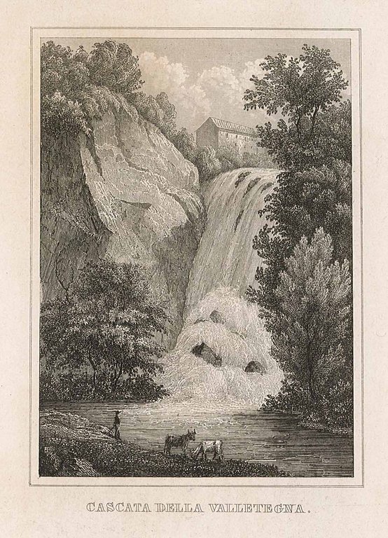 Stampa, antica ed originale, con la particolare cascata della Valletegna in Brianza. Tratta dall'opera "Das Klaine Universum" pubblicata a Stoccarda nel 1841. Autore: Scheible J. Luogo: Brianza - Vallategna. Anno: 1841. Tecnica: incisione in acciaio. Dimensioni: 100x72 mm