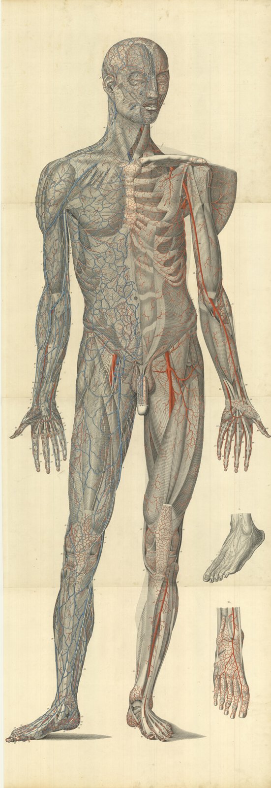 Rappresentazione in scala 1:1 del corpo umano in quattro fogli (660x500 mm ciascuno). Il disegno raffigura la rappresentazione in scala 1:1 del corpo umano in quattro fogli (660x500 mm ciascuno). Il disegno raffigura l'apparato scheletrico anteriore. Inserita nella famosa opera che riproduceva il corpo umano in grandezza naturale "Anatomischer Atlas des Menschlichen Körpers in natürlicher Größe, Lage und Verbindung der Theile in 84 Tafeln und erklärendem" descritta dal Weber. Moritz Ignaz Weber (1795-1875) fu stimato Professore di Anatomia Comparata e Patologica. Spese tutta la sua vita nel campo dell'anatomia e delle scienze associate pubblicando numerosi studi. L’Anatomischer Atlas, che raffigura il corpo umano in 84 tavole litografiche a grandezza naturale, è senza dubbio uno dei suoi lavori più importanti. Inserita nella famosa opera che riproduceva il corpo umano in grandezza naturale "Anatomischer Atlas des Menschlichen Körpers in natürlicher Größe, Lage und Verbindung der Theile in 84 Tafeln und erklärendem" descritta dal Weber. Moritz Ignaz Weber (1795-1875) fu stimato Professore di Anatomia Comparata e Patologica. Spese tutta la sua vita nel campo dell'anatomia e delle scienze associate pubblicando numerosi studi. L’Anatomischer Atlas, che raffigura il corpo umano in 84 tavole litografiche a grandezza naturale, è senza dubbio uno dei suoi lavori più importanti. Autore: Weber, Moritz Ignaz (1795-1875). Luogo: Anatomia. Anno: 1849. Tecnica: incisione in rame. Dimensioni: mm 1950x670 i fogli uniti