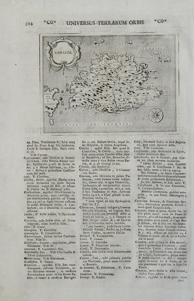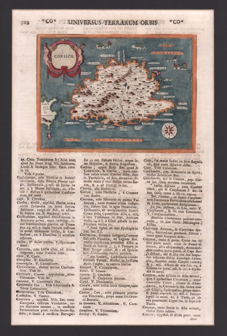 Carta geografica dell'isola, per la prima volta pubblicata nel volume “L’isole Piu Famose Del Mondo Descritte Da Thomaso Porcacchi Da Castiglione Aretino E Intagliate Da Girolamo Porro Padovan” di Tommaso Porcacchi (ca. 1532-1576), umanista e letterato originario di Castiglion Fiorentino.Gli interessi geografici coltivati sin dal Pomponio Mela del 1557 diedero vita nel 1572 al trattato, pubblicato dalla società tra il libraio Simone Galignani e l’incisore padovano Girolamo Porro, che si servirono della tipografia di Giorgio Angelieri (con privilegio di 10 anni concesso il 16 luglio 1572). Secondo Valerio (cfr. Valerio-Spagnolo, Sicilia 1477-1861, La Collezione Spagnolo-Patermo in quattro secoli di Cartografia, 2014, p. 163) il volume sarebbe stampato nell’officina di Domenico e Giovan Battista Guerra. Il volume, in formato in quarto, con dedica di Galignani a don Giovanni d’Austria, presenta le magnifiche tavole calcografiche di Porro (una seconda edizione, cospicuamente accresciuta di testo e tavole, usci nel 1576, poi ancora, postume, nel 1590, 1604, 1605, 1620 e 1686). Nella lettera dedicatoria Porro narra di essere stato il promotore dell’operazione e di aver incaricato Porcacchi di scrivere un libro sulle isole, riservandosene l’illustrazione. Il modello e quello degli “isolari”, sul quale però Porcacchi innesta lo spirito delle corografie antiche, aggiungendo per ciascuna isola una descrizione fisica, storica e culturale. La concezione e molto ampia (sono comprese penisole, grandi isole come l’Inghilterra o interi continenti: l’America Settentrionale), ma nel “Prohemio” Porcacchi fornisce un glossario di termini geografici che testimonia lo sforzo di impiegare in maniera corretta la terminologia della disciplina (cfr. Franco Pignatti, Porcacchi Tommaso, in "Dizionario Biografico degli Italiani" - Volume 85, 2016). Nel testo vi sono mappe di isole incise su mezza pagina, compreso il planisfero – riduzione della carta murale di Camocio del 1567 e la “carta da navigare con le rotte e i venti, di derivazione gastaldina. Questo esemplare è tratto dall'opera ' Universus terrarum orbis scriptorum calamo delineatus . qui de Europae, Asiae, Africae, & Americae regnis, provinciis, populis, civitatibus. pubblicata a Padova nel 1713, presso Matteo Cadorin, da Raffaello Savonarola, sotto lo pseudonimo di Lasor a Varea (o Varela). L'opera era una sorta di enciclopedia che conteneva notizie sulle varie località del mondo disposte in ordine alfabetico, arricchita da mappe e vedute di tutto il mondo che appartengono a celebri raccolte cartografiche del passato – Bertelli, Valegio, Camocio, Bonifacio, Nelli, Magini e altri – del quale probabilmente l’editore Cadorin era in possesso delle matrici originali. Incisione su rame, finemente colorata a mano, in ottimo stato di conservazione. Map taken form “L’isole Piu Famose Del Mondo Descritte Da Thomaso Porcacchi Da Castiglione Aretino E Intagliate Da Girolamo Porro Padovan” by Tommaso Porcacchi (ca. 1532-1576), humanist and scholar from Castiglion Fiorentino. The geographical interests cultivated since Pomponio Mela in 1557 gave life to the treatise published in 1572 by the company between the bookseller Simone Galignani and the Paduan engraver Girolamo Porro, who used the typography of Giorgio Angelieri (with the privilege of 10 years July 1572). The volume, with a dedication by Galignani to Don Giovanni d'Austria, presents the magnificent calcographic plates by Porro (a second edition, conspicuously augmented with text and tables, came out in 1576, then again, posthumously, in 1590, 1604, 1605, 1620 and 1686). In the dedicatory letter Porro tells of having been the promoter of the operation and of having entrusted Porcacchi with writing a book on the islands, reserving the illustration. The model is that of the "isolari", on which however Porcacchi inserts the spirit of ancient chorographies, adding a physical, historical and cultural description for each island. The concept is very broad (including peninsulas, large islands such as England or entire continents: North America), but in the "Prohemio" Porcacchi provides a glossary of geographical terms that testifies to the effort to correctly use the terminology of the discipline (see Franco Pignatti, Porcacchi Tommaso, in "Dizionario Biografico degli Italiani" - Volume 85, 2016). In the text there are maps of islands engraved on half a page, including the planisphere - reduction of the wall map of Camocio of 1567 and the "carta marina”. This example is taken from the work ' Universus terrarum orbis scriptorum calamo delineatus . qui de Europae, Asiae, Africae, & Americae regnis, provinciis, populis, civitatibus. ' published in Padua in 1713, at Matteo Cadorin, by Raffaello Savonarola, under the pseudonym of Lasor a Varea (or Varela). The work was a kind of encyclopedia containing news about the various localities of the world arranged in alphabetical order, enriched with maps and views of the whole world belonging to famous cartographic collections of the past-Bertelli, Valegio, Camocio, Bonifacio, Nelli, Magini, and others-of which the publisher Cadorin probably possessed the original plates. Copper engraving, fine later hand colour, in excellent condition. Cfr. F. Cervoni, "Image de la Corse", 9