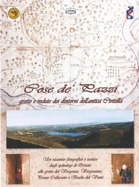Importante volume di speleologia di cm 25x33 di 93 pag, copertina rigida, interamente stampato a colori. Il sottotitolo "Un racconto fotografico e tecnico degli speleologi di Orvieto alle grotte del Vorgozzo, Vorgozzino, Pozzo Callarano e Buche del Vento", ci illustrano il contenuto del volume. Prima di questa pubblicazione queste grotte erano conosciute solamente a pochi speleologi e mai, nemmeno i cittadini del luogo ne avevano potuto ammirare la loro bellezza, se non per il sentito dire. Oltre alle fotografie, tecniche e scenografiche, scattate dagli speleologi di Orvieto, vi sono pubblicate bellissime fotografie di Leonardo Noccioni che ci mostrano scorci di borghi nei dintorni di queste cavità: Civitella del Lago, Acqualoreto, Morre, Collelungo, Morruzze, Vagli, Salviano, Scoppieto, Cerreto. Questo volume fa parte della collana Cose de' Pazzi derivata dall'antico nome Civitella de' Pazzi ora Civitella del Lago pubblicata dall'Associazione Culturale Civitellarte