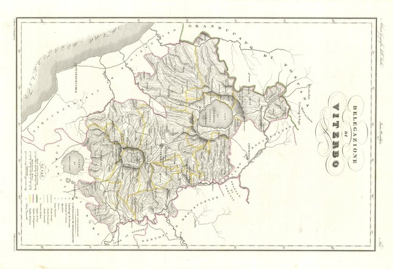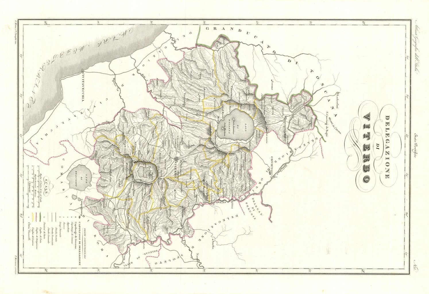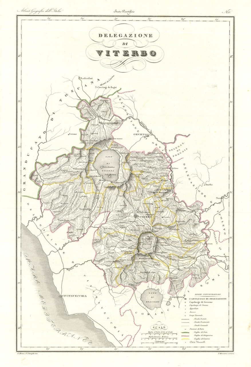 Carta geografica, antica ed originale, con rappresentazione della divisione territoriale del territorio di Viterbo con evidenziati i territori nei dintorni di Acquapendente, Lago di Bolsena, Bagnoreggio, Toscanella, Soriano delCimino, Vetralla, Caprarola, Lago di Vico, Ronciglione, Civita Castellana, Sutri. Inserita nel I volume dell'opera "Atlante Geografico degli Stati Italiani delineato sopra le migliori e più moderne mappe per servire di corredo alla Corografia Fisica Storica e Statistica dell'Italia" contenente le carte dell'Italia Superiore. Autore: Zuccagni - Orlandini edit. & G.Maina e V.Stanghi inc. Luogo: Viterbo. Anno: 1844. Tecnica: incisione in rame. Dimensioni: 518x336 mm. Descritta da Attilio Zuccagni-Orlandini, edita e stampata a Firenze nel 1844-45. L'incisione è caratterizzata da una coloritura coeva ai confini