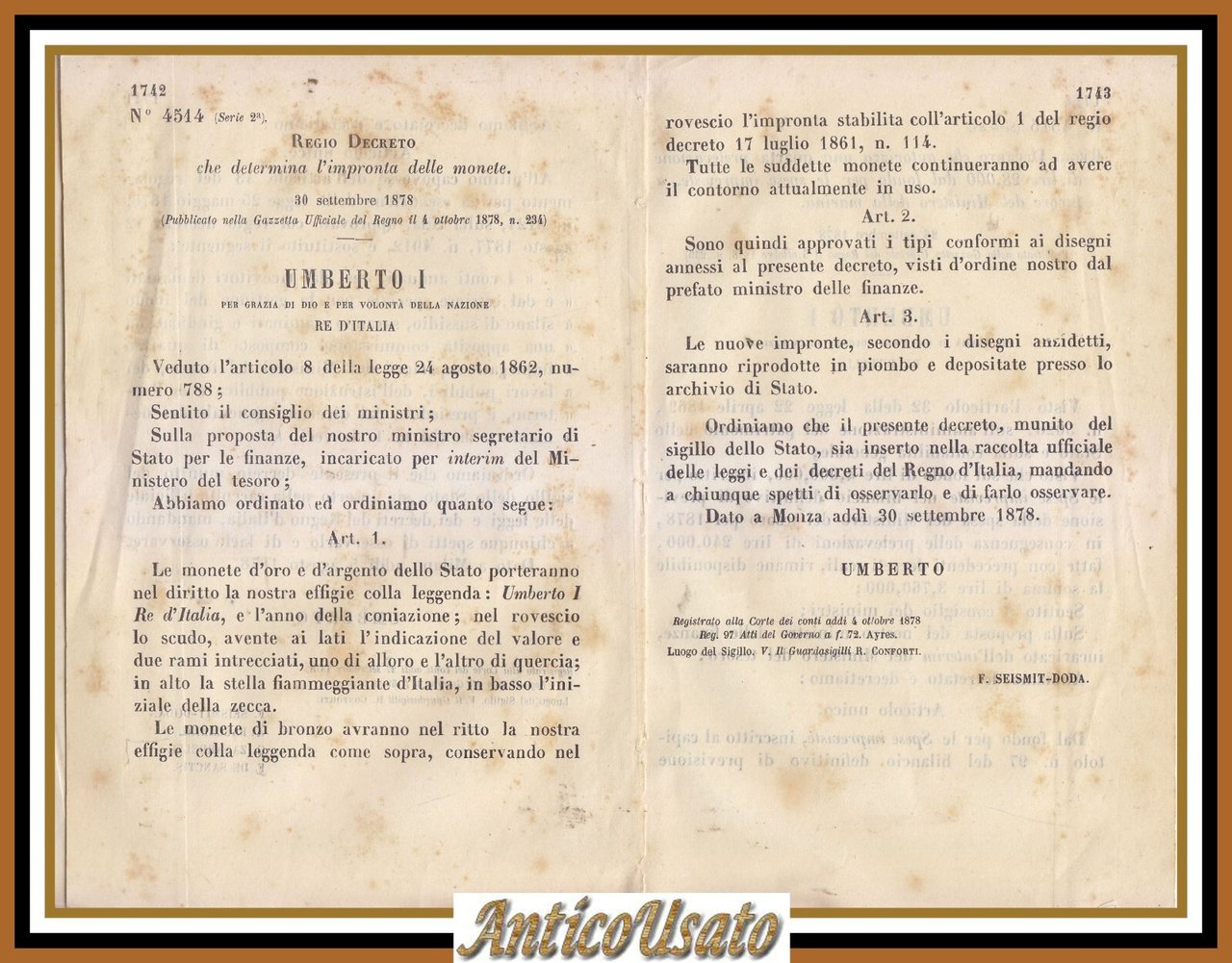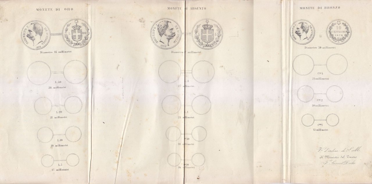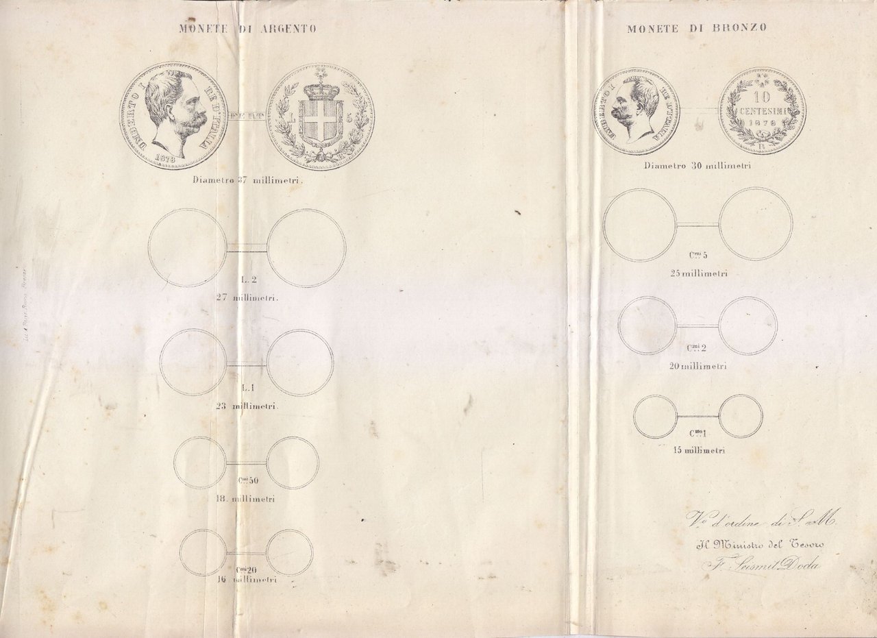 DETERMINA L'IMPRONTA DELLE MONETE di Umberto I REGIO DECRETO 1878 Originale