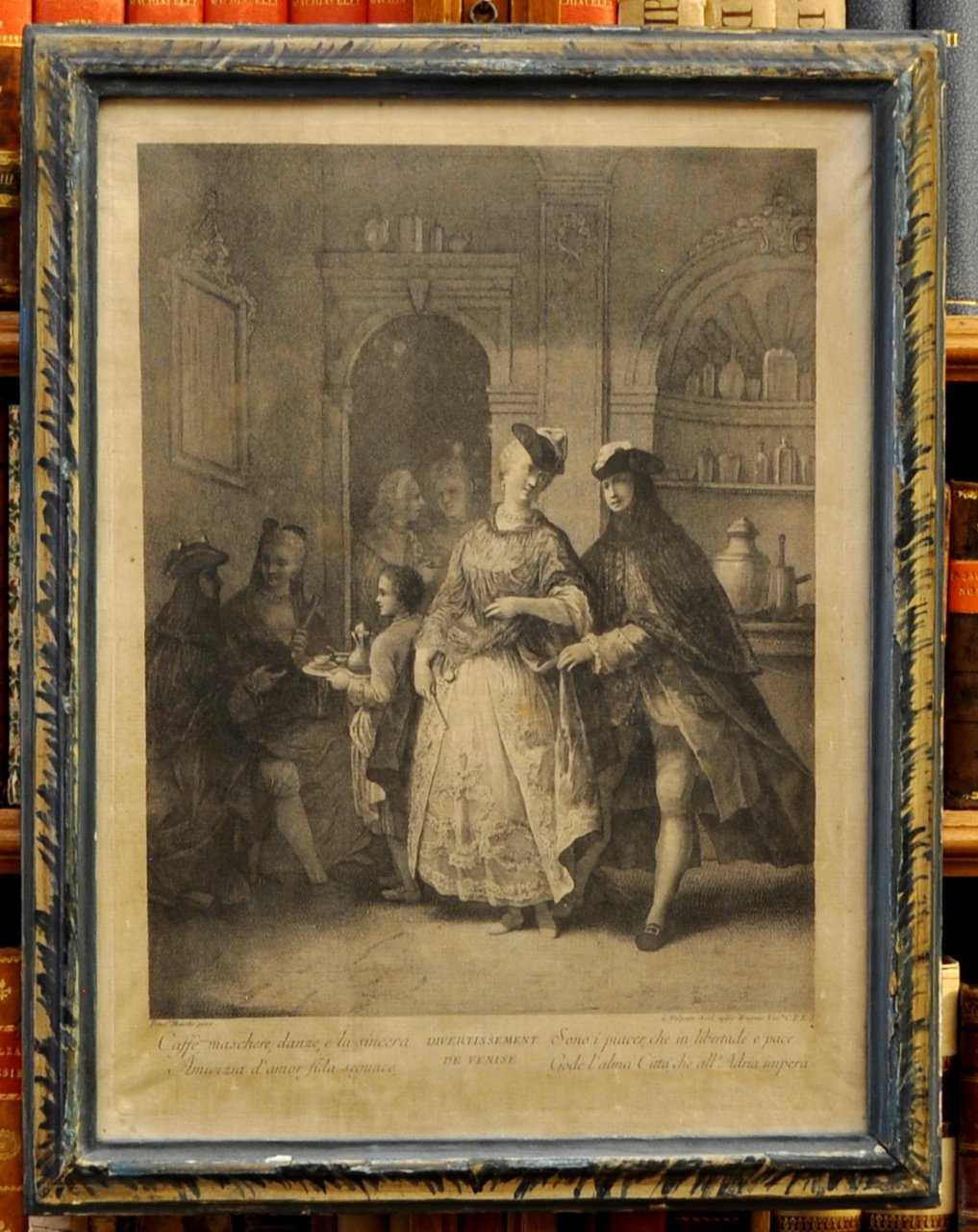 Incisione all'acquaforte di mm 398 x 290 alla battuta. Il foglio è inserito nella sua bella cornice verde originale settecentesca, con il vetro dell'epoca. Sotto al centro "Divertissement de Venise" e lateralmente "Caffè, maschere, danze e la sincera Amicizia d'amor fida seguace, Sono i piacer, che in libertade e pace Gode l'alma Cittò. che all'Adria impera". Il foglio fa parte di una serie di incisioni di Wagner da dipinti di Maggiotto e Berardi, a proposito di uno dei quali Succi afferma "La scenetta fu attinta dal Wagner dal repertorio che Maggiotto andava svolgendo al di fuori della linea accademica e aulica. Il successo di questa piacevoli composizioni fu notevole e la loro richiesta da parte di un certo tipo di collezionismo meno impegnato fu sicuramente promossa dalla large diffusione delle stampe di Wagner e di Volpato". Come è noto la bottega di Wagner fu per tutta la seconda parte del settecento il centro vitale della incisione veneziana; l'artista tedesco trapiantato a Venezia, viene considerato da Pignatti (1969) "Senza dubbio il maggior incisore professionista del Settecento veneziano".Etching 398 x 290 mm on the stroke. The sheet is inserted in its beautiful original eighteenth-century green frame, with the glass of the time. Under the center "Divertissement de Venise" and laterally "Coffee, masks, dances and the sincere Friendship of love faithful follower, They are the pleasures, which in freedom and peace Enjoys the alma Cittò. Which reigns in the Adria". The sheet is part of a series of engravings by Wagner from paintings by Maggiotto and Berardi, about one of which Succi states "The skit was drawn by Wagner from the repertoire that Maggiotto was developing outside the academic and noble line. The success of these pleasant compositions was noteworthy and their request by a certain type of less committed collectors was certainly promoted by the widespread diffusion of Wagner and Volpato's prints ". As is well known, Wagner's workshop was the vital center of Venetian engraving throughout the second part of the eighteenth century; the German artist transplanted to Venice, is considered by Pignatti (1969) "Without doubt the greatest professional engraver of the Venetian eighteenth century".
