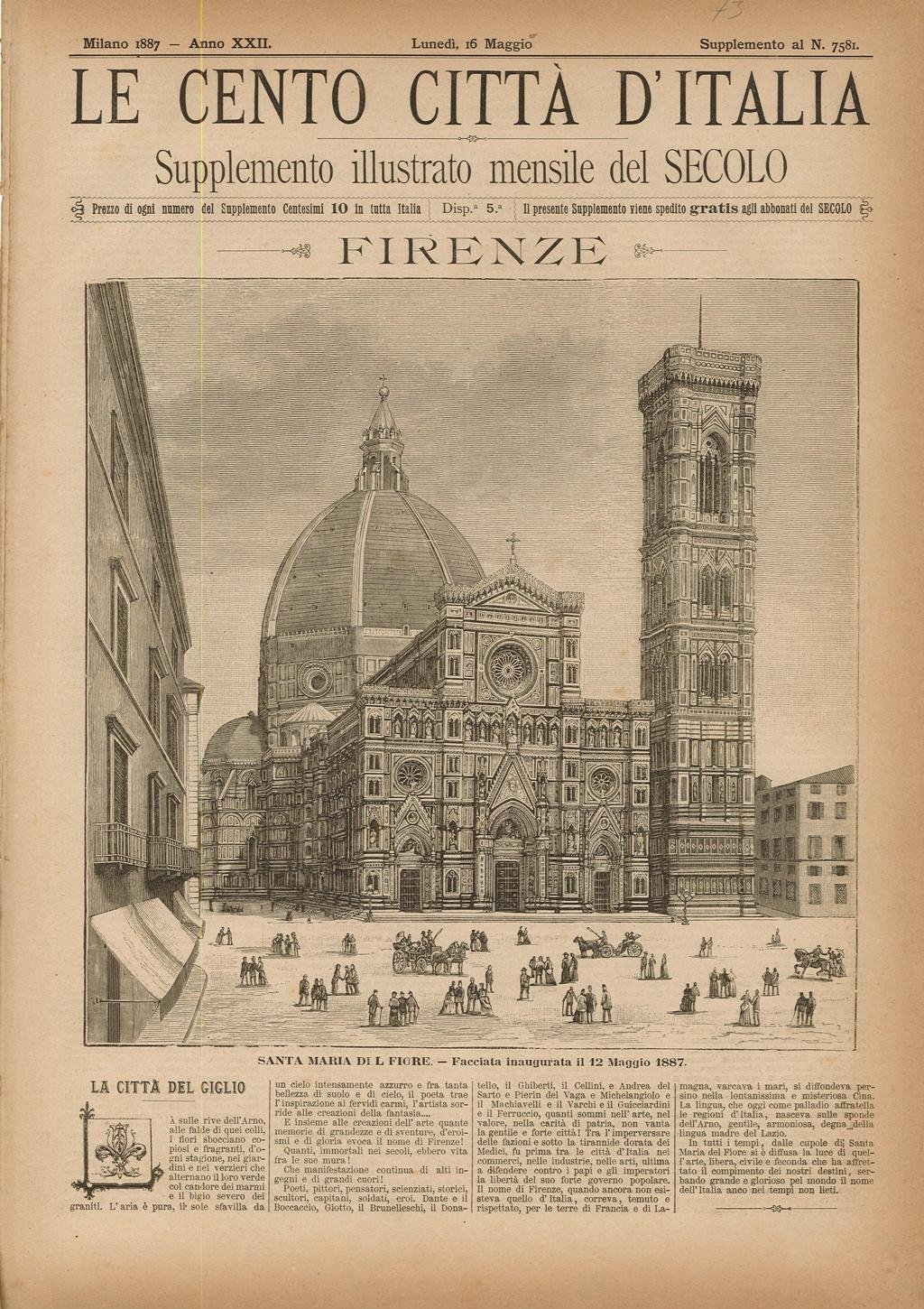 Fascicolo originale completo di 8 pp. pubblicato nella "Serie Prima" della Collana Illustrata delle LE CENTO CITTÀ D'ITALIA, supplemento illustrato del SECOLO edito a Milano da Edoardo Sonzogno Editore, Il fascicolo riporta nel testo interessanti notizie sulla città e dintorni ed è illustrato da numerose vedute xilografiche inserite nella prima pagina, pagine centrali, ultima facciata e le più rappresentative sono: