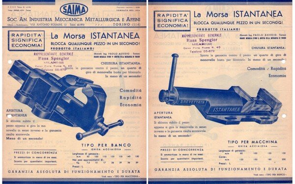 Foglio pubblicitario SAIMA Soc. An. Industria Meccanica Metallurgica e Affini. La morsa istantanea