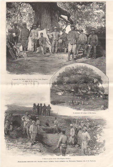 Composizione di immagini: I generali Del Maino e Barbieri col loro Stato Maggiore al campo di Mai Serau - Il sicomoro del campo di Mai Serau - I forni in piena terra della brigata Barbieri. Testo al retro