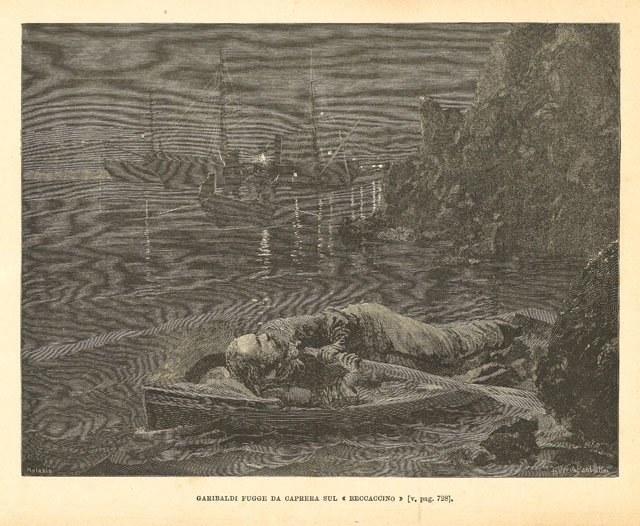 Rappresentazione della fuga di Garibaldi dall'isola a bordo di una barca