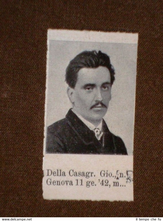 Rara stampa Estratta da Rivista d'epoca del 1910. .stampa che ha quindi oltre 104 anni! Garibaldino che partecipò alla spedizione dei Mille con Garibaldi Della Casagr. Giovanni di Genova e Coli Gaetano di Budrio II1910-030 Dimensioni Fronte/retro Cm 3,50 x 6,00 + Cm 3,50 x 6,00 Qualora vogliate delle scansioni migliori contattateci, soddisferemo ogni vostra richiesta. PaypalCarta di creditoBonifico bancario Accuratamente adagiate su un cartoncino e protette da pellicola trasparente rigida,il tutto viene inserito dentro plico di adeguate dimensioni per proteggerne l'integrità.
