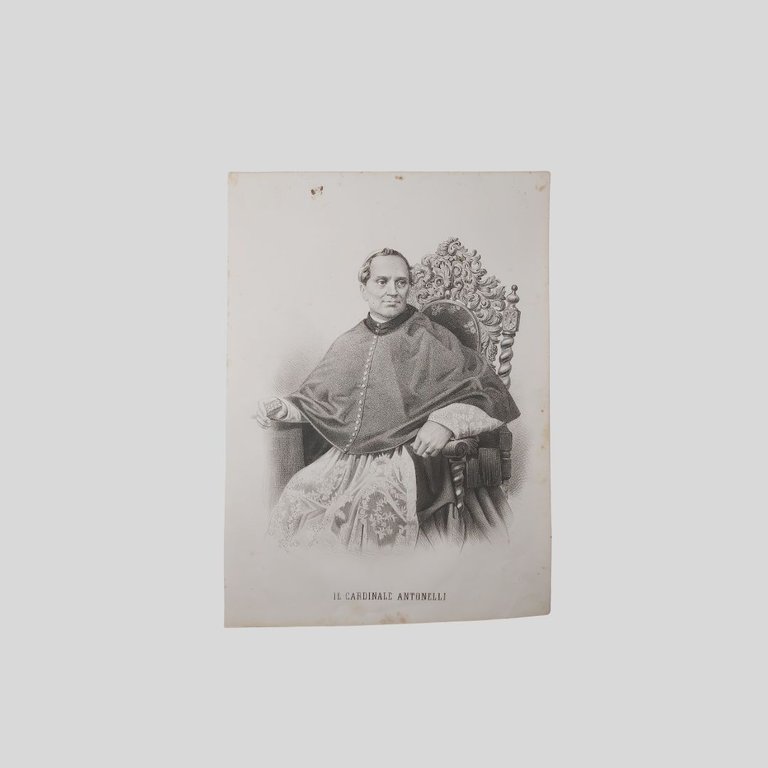 Litografia originale su carta tratta da Domenico Valente, Storia della guerra di Sicilia, Napoli, 1862. Tavola sciolta, cm 35×25. Naturali tracce d’uso, qualche fioritura, in buone condizioni. Litografia originale raffigurante il Cardinale Giacomo Antonelli, protagonista delle vicende risorgimentali italiane. La tavola è tratta dall’opera di Domenico Valente, Storia dell’Italia centrale dopo la pace di Zurigo e della guerra di Sicilia e dei fatti posteriori, Napoli, A. Morelli, 1862. Una delle più importanti testimonianze iconografiche e narrative degli eventi legati alla spedizione dei Mille e alla successiva integrazione della Sicilia nel Regno d’Italia. Il ritratto, realizzato secondo il gusto ottocentesco, restituisce un’immagine ufficiale e celebrativa del personaggio, sottolineandone il ruolo istituzionale, militare o politico all’interno del processo risorgimentale.<BR>Si tratta di una stampa originale dell’epoca, non di una riproduzione moderna, destinata in origine alla consultazione e alla divulgazione storica, oggi apprezzata come documento collezionistico e iconografico. Esemplare di sicuro interesse per collezionisti di Risorgimento italiano, storia militare, iconografia ottocentesca e per studiosi del processo di unificazione nazionale. Giacomo Antonelli [Sonnino 1806-Roma 1876] è stato un cardinale italiano, ultimo segretario di stato dello Stato Pontificio sotto il pontificato di Papa Pio IX. Di sentimenti politici profondamente reazionari e assolutisti, impresse una svolta fortemente conservatrice e intransigente alla politica pontificia