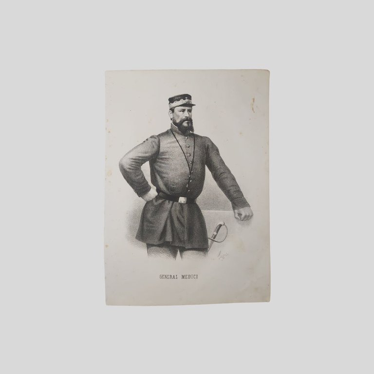 Litografia originale su carta di Gaetano Riccio, tratta da Domenico Valente, Storia della guerra di Sicilia, Napoli, 1862. Tavola sciolta, cm 35×25. Naturali tracce d’uso, qualche fioritura, in buone condizioni. La tavola è tratta dall’opera di Domenico Valente, Storia dell’Italia centrale dopo la pace di Zurigo e della guerra di Sicilia e dei fatti posteriori, Napoli, A. Morelli, 1862. Una delle più importanti testimonianze iconografiche e narrative degli eventi legati alla spedizione dei Mille e alla successiva integrazione della Sicilia nel Regno d’Italia. Il ritratto, realizzato secondo il gusto ottocentesco, restituisce un’immagine ufficiale e celebrativa del personaggio, sottolineandone il ruolo istituzionale, militare o politico all’interno del processo risorgimentale. Si tratta di una stampa originale dell’epoca, non di una riproduzione moderna, destinata in origine alla consultazione e alla divulgazione storica, oggi apprezzata come documento collezionistico e iconografico. Esemplare di sicuro interesse per collezionisti di Risorgimento italiano, storia militare, iconografia ottocentesca e per studiosi del processo di unificazione nazionale. Giacomo Medici [Milano 1816-Roma 1862] è stato un generale e politico italiano. La sua è la figura di uno dei più valenti e costanti ufficiali di Giuseppe Garibaldi e in seguito vittorioso generale dell’Esercito Regio nella Terza guerra di indipendenza, nominato successivamente prefetto in Sicilia, e senatore del Regno d’Italia.