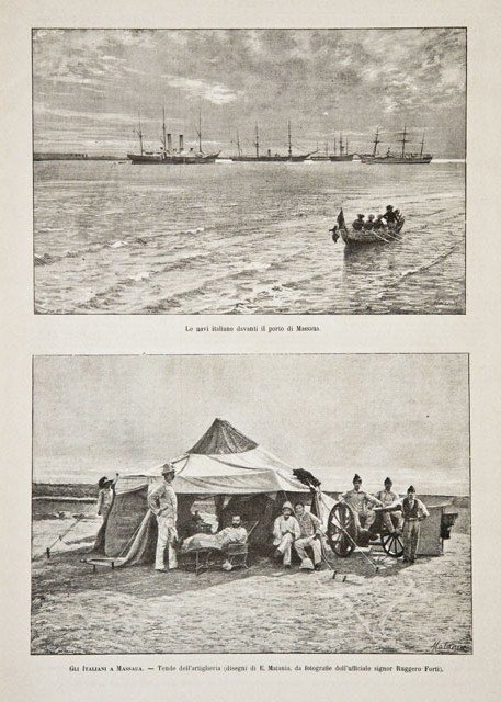 Gli italiani a Massaua / Le navi davanti il porto di Massaua / Tende dell’artiglieria