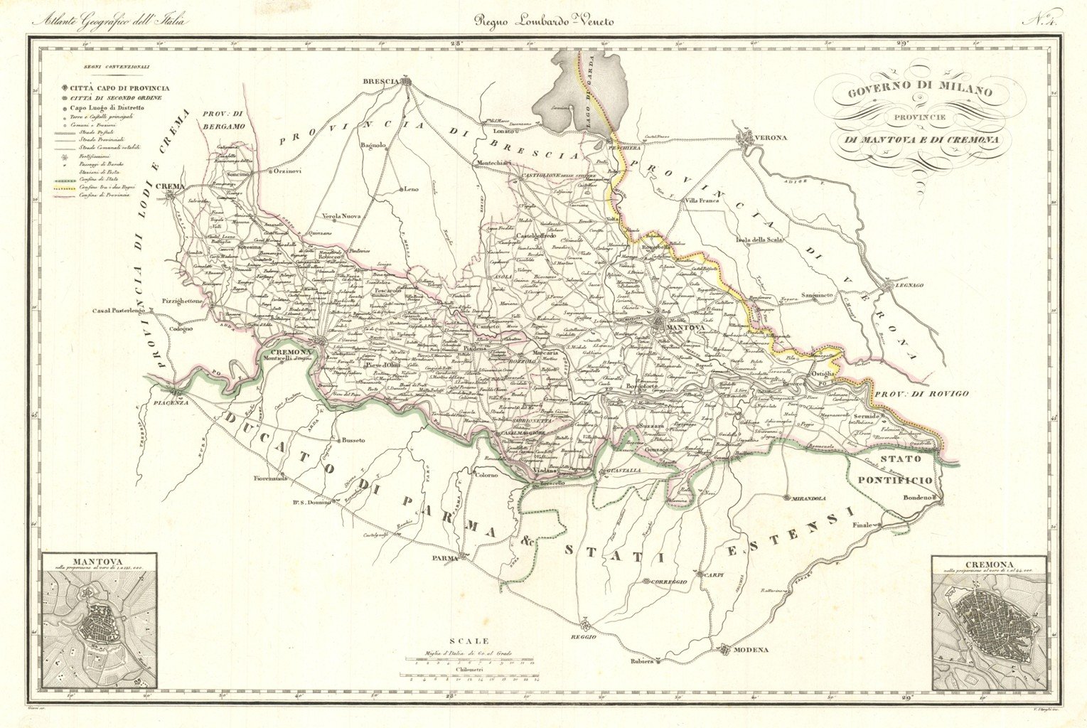 Carta geografica, antica ed originale, con rappresentazione del territorio del Governo di Milano in particolare delle Provincie di Mantova e Cremona. In basso agli angoli, entro con riquadri, le piantine topografiche delle città di Mantova e Cremona. Inserita nel I volume dell'opera "Atlante Geografico degli Stati Italiani delineato sopra le migliori e più moderne mappe per servire di corredo alla Corografia Fisica Storica e Statistica dell'Italia" contenente le carte dell'Italia Superiore. Descritta da Attilio Zuccagni-Orlandini, edita e stampata a Firenze nel 1844-45. Autore: Zuccagni - Orlandini edit. & V. Stanghi inc. Luogo: Mantova - Cremona. Anno: 1844. Tecnica: incisione in rame. Dimensioni: 334x517 mm. L'incisione è caratterizzata da una coloritura coeva ai confini