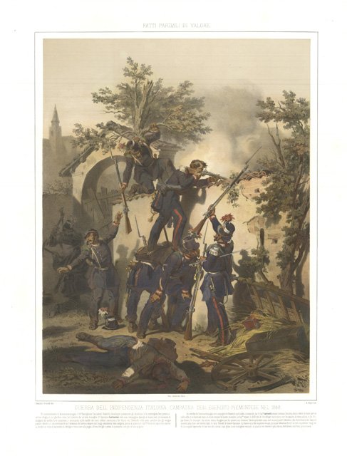 Raffigurazione dell'atto coraggioso del soldato Perrier, che si precipita davanti al suo Sottotenente, rimanendo così colpito a morte. In calce descrizione dell'accaduto, in italiano e in francese. L'incisione è caratterizzata da una bella coloritura coeva.