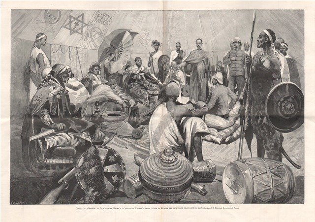 Guerra in Abissinia - Il maggiore Salsa e il capitano Angherà nella tenda di Menelik per le fallite trattative di pace
